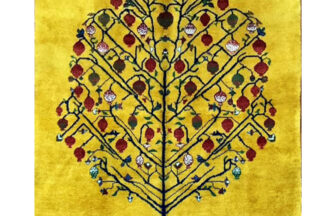 ザクロの皮で染めた鮮やかな黄色をベースに、一本のザクロの樹を描いた印象的なデザインです。周りには小さな動物が可愛らし…