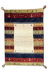 色とりどりのストライプ柄とセンターのナチュラルカラーとのコンビネーションが素敵な作品です。ストライプの中は、富の象徴のラクダや家族円満の鹿などが描かれています。